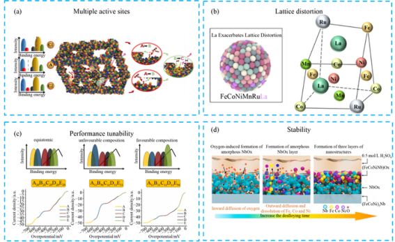 高熵合金作为电催化剂的结构优势主要体现在四个方面:其一,多活性位点。其复杂表面可形成不同吸附能的活性位点,适配多步级联反应,例如在CO2RR中,不同位点可选择性捕获CO中间体并促进其进一步还原为多碳产物。其二,晶格畸变。原子半径差异与无序排列导致的晶格畸变可改变活性位点电子结构,优化反应中间体吸附能,如La掺杂的FeCoNiMnRuLa高熵合金中,La引入增强的晶格畸变促进了d-d轨道电子转移,提升了析氧反应(OER)活性。其三,性能可调性。通过调整元素种类、比例与结构,可精准调控催化性能,例如改变元素摩尔比可增加对应结合峰的活性位点数量,从而提升电流密度。其四,稳定性。多组元协同能够提供额外的电荷补偿中心,抑制活性金属溶解,在强腐蚀环境中表现出更优的耐久性。