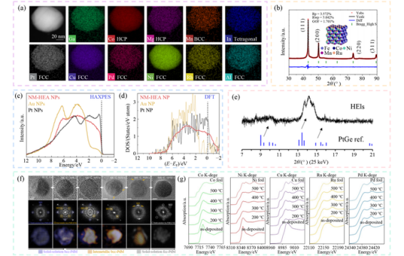 表征技术是解析高熵合金构效关系的关键。元素与形貌分析依赖电感耦合等离子体(ICP)、三维原子探针断层扫描(3D-APT)及扫描透射电子显微镜-能量色散X射线谱(STEM-EDX)等技术,可揭示元素分布与纳米结构。结构与相分析主要通过粉末X射线衍射(PXRD)、傅里叶变换扩展X射线吸收精细结构(FT-EXAFS)及高分辨扫描透射电子显微镜(HR-STEM),可确认单相固溶体结构及晶格参数。表面化学态分析借助X射线光电子能谱(XPS)、X射线吸收光谱(XAS)及硬X射线光电子能谱(HAXPES),可揭示表面元素价态与电子结构。原位表征技术则可实时观察高熵合金在制备与反应过程中的动态变化。