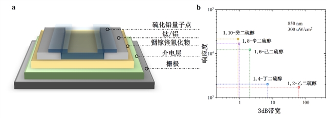 图2. (a) 器件结构示意图;(b) 使用不同硫醇处理后,器件响应度与3 dB带宽关系图