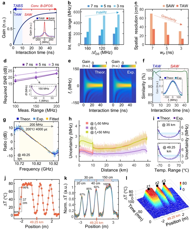 图3. 基于瞬态声波的布里渊光时域分析仪传感器(TABS)的物理特性及传感性能。