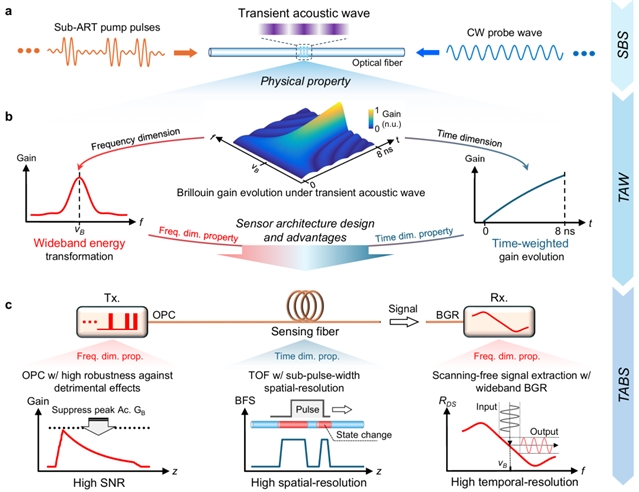 图2. 基于瞬态声波的布里渊光时域分析仪传感器(TABS)的工作原理。(a) 受激布里渊散射作用过程。ART:声波响应时间。当泵浦光与探测光相互作用时间小于10ns时,声波处在瞬态。SBS:受激布里渊散射,TAW:瞬态声波。(b) 瞬态声波下的能量转换特性。n.u.: 归一化单位, vB:布里渊频移, Freq. dim.: 频域。(c) 功能协同传感器架构设计。Freq. dim. prop.: 频域特性, Tx: 发射机, Rx: 接收机, OPC: 光脉冲编码, Ac. GB: 累积布里渊增益, TOF: 飞行时间定位法, BGR: 布里渊增益比值, SNR: 信噪比. 基于瞬态声波的宽带、时变能量转换特性设计传感器架构,使各部分功能间协同互补,克服关键传感性能间相互制约,实现长距离、高时空分辨率传感。
