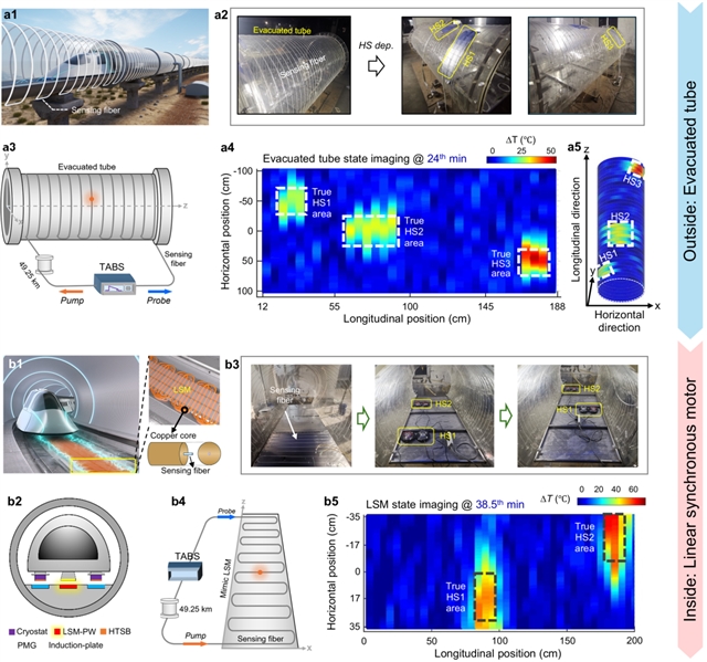 此外,真空管道内部的同步直线电机是驱动列车运行的关键电磁力机构(图4b1, 4b2)。同步直线电机由布设于地面的初级绕组和固定于车辆下方的次级永磁体(感应板)组成。初级绕组通电后产生移动磁场驱动列车运行。驱动列车所需的巨大功率和真空管道内部极弱的空气散热能力使初级绕组较易出现温升情况,威胁直线电机安全和列车运行稳定。在该研究中,作者们探索了通过光纤传感实现同步直线电机二维温升成像的可行性(图4b3-4b5)。鉴于初级绕组折返布设方式,实验中传感光缆以折返式布设于模拟直线电机之上。实验结果表明,TABS以小于3厘米的中心坐标误差对模拟电机温升进行了成像。