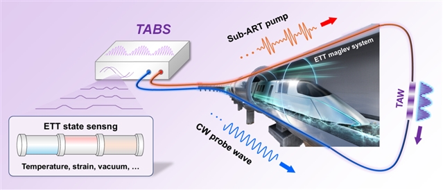图1. 基于分布式瞬态布里渊光纤传感的真空管道磁浮交通系统多维状态感知技术。TABS:基于瞬态声波的布里渊光时域分析仪传感器, ART: 声波响应时间, TAW: 瞬态声波, ETT: 真空管道。