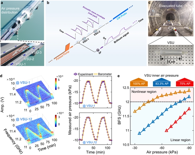 除上述对有形目标的检测外,该工作还探索了管道真空度分布式测量的可行性。由于气动阻力随列车速度的二次方增长,因此真空度分布的不均匀性将引起亚音速或超音速行驶列车的抖动、发热甚至形变,威胁列车安全和稳定(图5a)。为实现对管道内部真空度分布的精准测量,作者们提出了一种基于真空敏感阵列的分布式布里渊真空度传感方案。在该方案中,真空敏感阵列由级联的真空敏感单元组成,目的是将真空度变化转换为光纤局部应变变化,同时结合受激布里渊散射独有的频率选择特性,实现管道真空度的超空间分辨率分布式测量(图5b, 5c)。实验中,他们实现了气压分辨率达33.3 Pa的分布式真空度传感(图5d, 5e),该分辨率可与商用精密气压表分辨率相媲美。