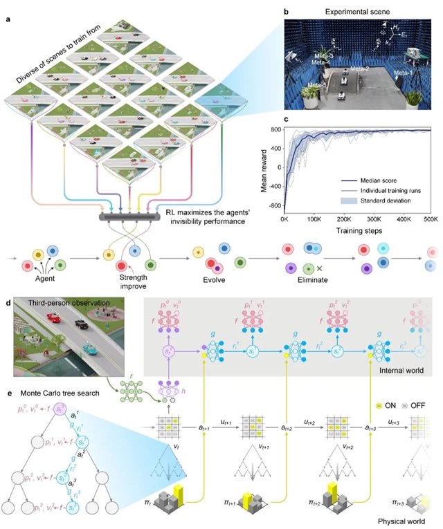 图2. MetaSeeker算法架构。(a)自主进化的强化学习策略;(b)微波实验场景;(c)每个强化学习智能体在训练过程中的隐形表现;(d)智能体的内部模型架构;(e)用于指导智能体实际决策行为的蒙特卡洛树搜索策略。