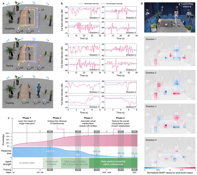 图3. 动态实验演示与可解释性分析。(a)三种动态实验演示的示意图;(b)实验隐身效果;(c)MetaSeeker表现能力随训练过程的进化;(d)MetaSeeker的可解释性分析。