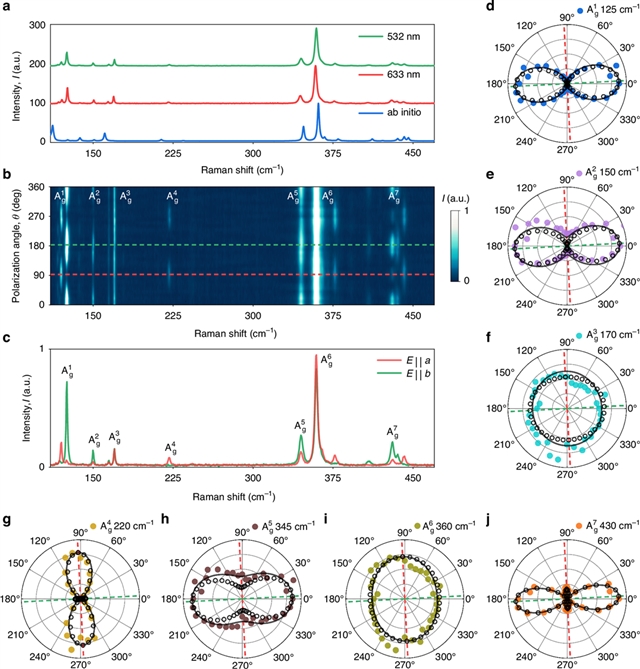 在材料表征方面,研究人员创新性地结合偏振拉曼光谱与第一性原理计算(如图2),系统解析了二硫化锗的13种振动模式起源。通过角度分辨拉曼强度分析,首次明确了5种特征振动峰(如125 cm-1、150 cm-1)与晶体学a/b轴的对应关系,并揭示了220 cm-1呼吸模式的各向同性特性。这种跨尺度的振动-光学关联研究,为理解二维材料的各向异性响应机制提供了重要理论支撑。