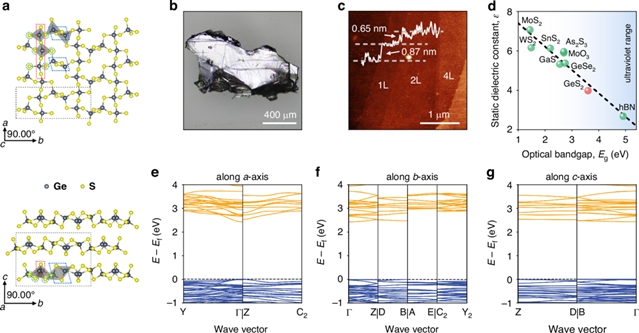 图1. 范德华二硫化锗的晶体结构及其各向异性特征