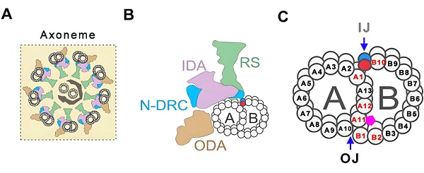 研究揭示纤毛鞭毛轴丝外周二联体微管A-B管连接机制。纤毛/鞭毛是广泛存在于真核生物中的特殊细胞器,其核心结构是微管与相关蛋白组装成的轴丝复合体。轴丝外周由9组二联体微管(DMTs)构成,每个DMT由A管和B管组成。其中,A管为完全微管,由13根原纤丝环绕而成;B管为不完全微管,仅含10根原纤丝。A管与B管存在两个连接位点,分别为外侧连接点(OJ)和内侧连接点(IJ)。A管与B管的紧密连接对于维持DMTs稳定性发挥具有重要作用,若DMT-B管发生开放,将直接影响各种轴丝附属结构的附着或功能协调。因此,明确纤毛轴丝DMTs结构中,A管与B管连接的组成蛋白和调控机制,有助于学界理解轴丝结构、纤毛功能及其纤毛病发病机理。