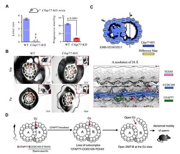 研究团队构建了Cfap77基因敲除小鼠模型。表型分析显示,Cfap77-KO小鼠出现雄性不育特征,其精子数量和形态基本正常,精子运动能力存在缺陷。团队通过透射电镜观察发现,Cfap77-KO小鼠精子轴丝中,约45%的DMT-B管出现明显开放现象。同时,蛋白表达与功能表型的对应,证实了CFAP77蛋白在维持DMTs中,A-B管OJ部位连接方面的关键生物学功能。