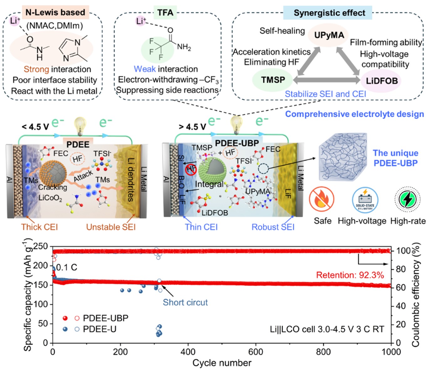 实验结果表明,该深共晶凝胶聚合物电解质具备优异的综合性能,其离子电导率(25°C)为2.83毫西门子每厘米,电化学窗口为5.6伏,能满足所有高电压正极需求,且锂离子迁移数高达0.68。(来源:中国科学报 李媛)