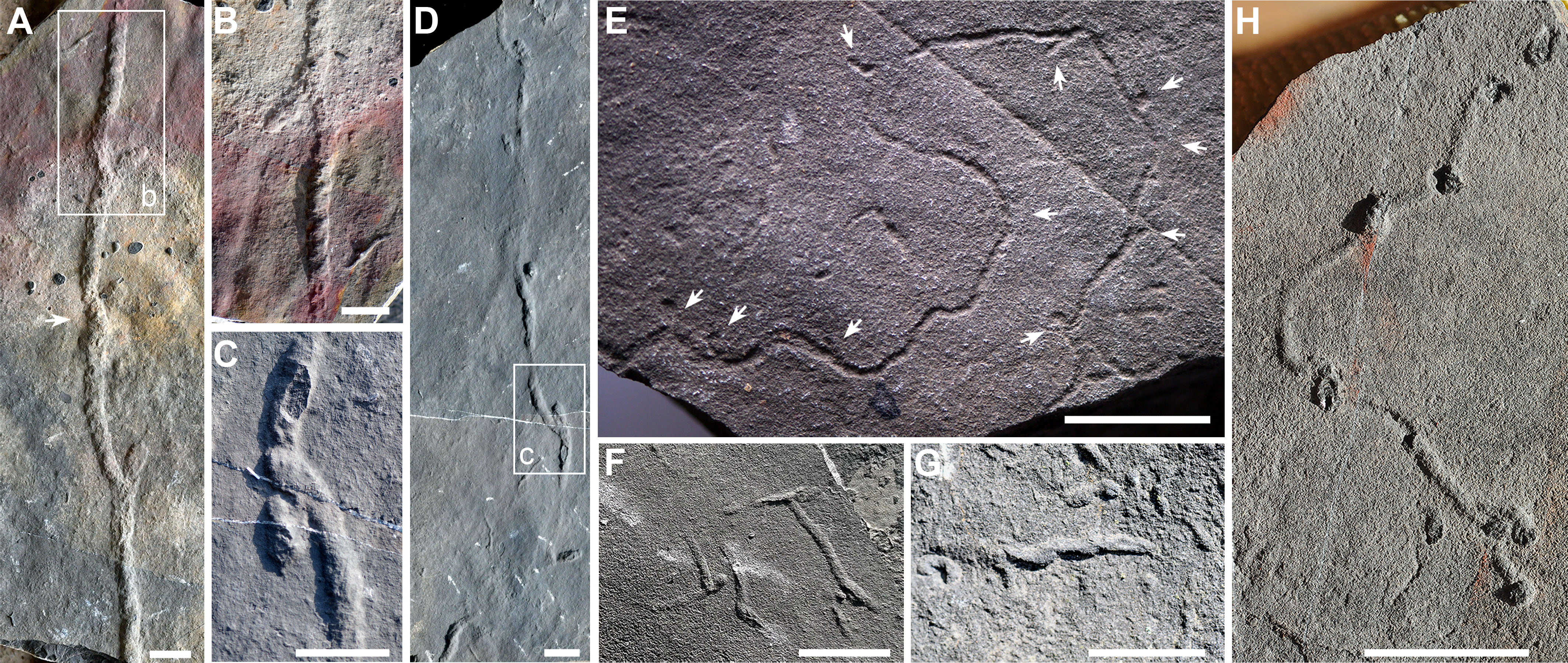 此前,学界普遍认为埃迪卡拉纪的生物,大多是在海底表面留下简单的爬痕或浅层水平潜穴。直到寒武纪,生物才逐渐发展出垂直或斜向挖掘沉积物的能力,形成复杂的三维潜穴系统。然而,研究团队在属于埃迪卡拉纪的三峡地区“石板滩生物群”遗迹中发现,化石具有类型多样的三维复杂潜穴系统遗迹,包括锯形迹、多山迹与蝌蚪状潜穴等类型。与更早期仅停留在沉积物表面的简单爬迹不同,三维潜穴是动物行为复杂化的重要标志,这些化石首次展现出动物向沉积物内部“纵向探索”的能力。这些精心构造的地下通道网络,表明它们不再是海底的“表面过客”,而是可进行有计划的、主动的沉积物探测,是能够主动挖掘、构建三维栖居空间的生态系统“工程师”。