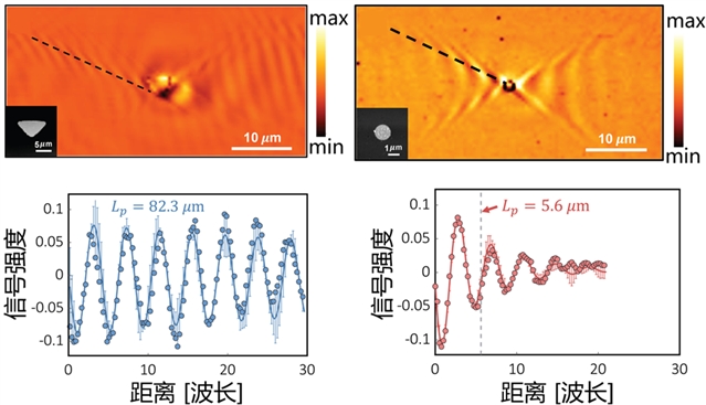 图2. SNOM显微镜探测结果,左边是三角形天线,黑色虚线处的信号强度在左下方展示。曲线拟合表明,三角形天线激发的极化子传播长度可达82.3微米。作为对比,右边展示了圆形天线的效果。