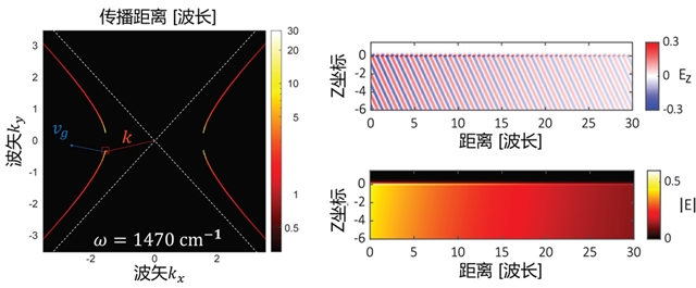 图3. 理论预测不同极化子模式的传播长度,较低k模式的传播长度可以达到数十倍真空波长。右边展示了红色方框对应极化子模式的电场分布,沿着x方向向右传播。
