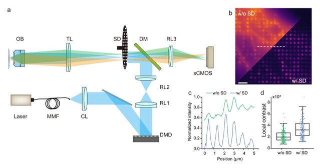 图1: C2SD-ISM光路图(a),以及转盘的引入对多焦点图像光斑可见度的提升(b-d)