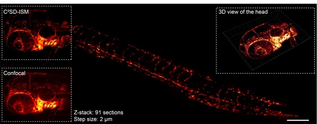 研究团队对EGFP标记的斑马鱼血管系统进行体积拼接成像(2.91 mm × 1.26 mm × 0.18 mm)。与传统共聚焦成像相比,C2SD-ISM显著提升了分辨率,揭示了许多在共聚焦图像中难以辨别的精细血管结构,并呈现出更为清晰的血管形态(图4)。