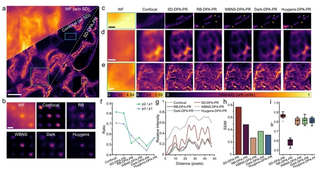 图3:基于转盘去离焦(SD-DPA-PR)和基于计算去背景方法(RB\WBNS\Dark\Huygens-DPA-PR),对超分辨重建结果的影响