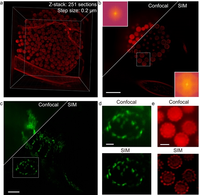 图5:C2SD-ISM系统在SIM模态下,对霉菌样本和EGFP标记的斑马鱼心外膜组织的成像结果