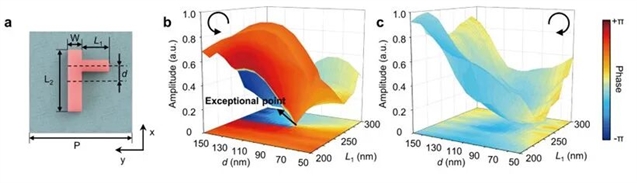 具体而言,研究团队通过大量扫描硅超构原子的形状与其几何参数(图2a),最终在左旋圆偏振光的提取通道中成功构建出奇异点(图2b),并且在围绕奇异点的附近观察到具有拓扑特性的相位分布;而在右旋圆偏振光通道中没有观察到类似奇异点的现象(图2c)。