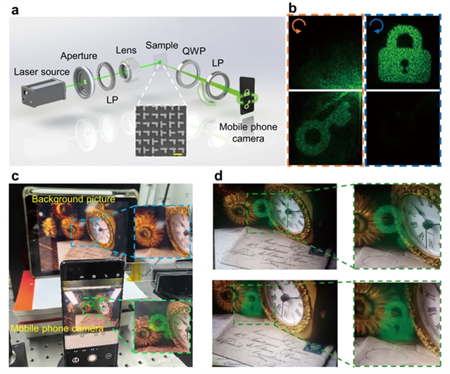 在此基础上,研究团队制备了片上超构表面样品用于实验表征。利用图3a中实验装置进行全息的测量,实验结果如图3b所示,展现出了较高的对比度和清晰度。作为AR功能的概念验证,进一步利用图3c中所示的装置进行AR的测量。值得注意的是,全息图像并没有出现在背景图片中,但是可以被手机摄像头捕捉,仿佛漂浮在背景之上。实验测量的AR图像如图3d所示,可以实现双通道的交替切换,并且免受零级衍射的干扰,具有较好清晰度。
