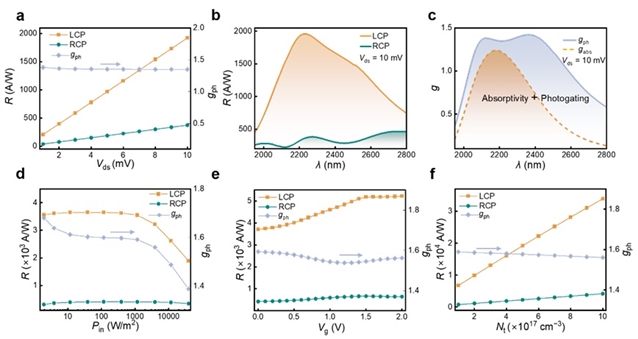基于上述半导体吸收非对称特性,研究人员进一步引入电学增益策略提升器件响应度。通过光电导效应产生的较强电增益,并结合光门控效应、栅极调控和陷阱效应的协同作用,该器件在保持高非对称因子的同时实现了超高响应度,性能远超同类报道。