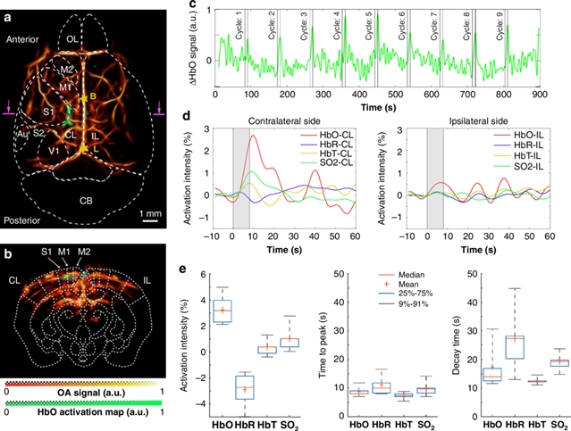 图5. 小鼠脑部血氧饱和度变化及脑部血流动力学响应成像