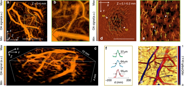 研究团队通过该技术清晰显示了人类手掌大型和小型血管以及皮肤表层的汗腺导管等细微结构。如图3所示,展示了在深度范围0-4 mm内,通过光声成像技术重建的深层血管的三维结构,以及深度范围100-200 μm内的浅表血管的分布和形态。通过多光谱成像,能够区分氧合血红蛋白(HbO)和脱氧血红蛋白(HbR),为评估血管的氧合状态提供了重要信息。