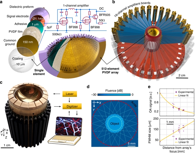 研究团队首先展示了基于PVDF薄膜的512通道高密度球形阵列(如图1所示),该阵列由半径15.02 mm的球形预制件制成,PVDF薄膜粘贴在预制件表面;此阵列包含512个约0.95 mm2的孔径,能够覆盖135°的成像范围,并利用光纤束进行样品照明。512通道与放大电子设备集成,512个信号由数据采集系统进行同步采集。该阵列覆盖了0.3-40 MHz超宽频段,能够实现高灵敏度、宽频带的光声信号检测。