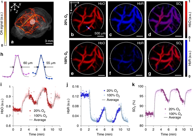 此外,研究团队还展示了基于该PVDF薄膜的高密度球形阵列在小鼠脑部功能成像中的应用。如图4所示,通过改变小鼠吸入气体氧含量,实现非侵入式监测脑部血管氧饱和度变化的5D光声成像,可清晰分辨小至55 μm的脑部血管。并对小鼠后爪进行电刺激,实现了脑部血流动力学参数的变化的实时监测。