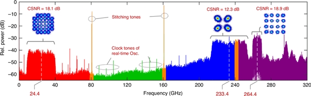 图3. 超宽带宽模拟信号的采样演示,由上述光子-电子ADC系统通过单次采样并在数字域重构获得。该宽带模拟信号由中心载频为24.4 GHz、233.4 GHz 和 264.4 GHz 的正交幅度调制(QAM)信号组成。三个星座图可从图中以水平括号表示的频段中提取。相邻频谱切片间的动态相位偏移补偿依赖于橙色所示的频谱重叠区域。