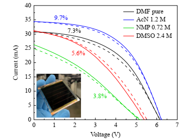 在25 cm2(有效 13.2 cm2)六片串联模组测试中(图3)AcN 1.2 M 体系效率 9.7%,Voc 与 FF 最高;纯 DMF 次之;DMSO 与 NMP 体系因褶皱或体相缺陷导致 FF/Voc 骤降,旋涂放大困难。
