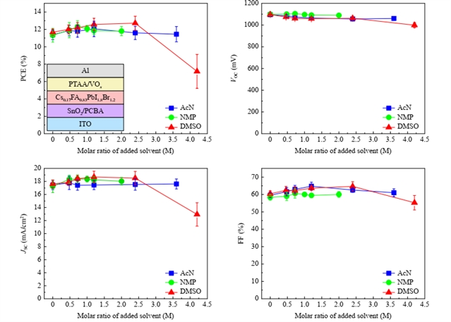 图1展示了 n-i-p 器件结构(ITO/SnO2/PCBA/钙钛矿/PTAA/VOx/Al)以及双溶剂中不同辅助溶剂及浓度对电池关键参数——光电转换效率(PCE)、开路电压(VOC)、短路电流密度(JSC)和填充因子(FF)的影响。纯 DMF 基准体系的效率约为 11–12%;加入第二种溶剂后,效率分别提升至:2.4 M DMSO 体系 12–13.5%,0.72 M NMP 体系 12–13%,1.2 M AcN 体系 11.5–12.5%。可以观察到,AcN 的加入主要使 FF 从 60% 提高到 67%;NMP 的加入将器件 JSC 从 17.3 提升至 18.3 mA/cm2;而 DMSO 则同时提升 JSC(17.3 → 18.5 mA/cm2)和 FF(60 → 67%),带来 PCE 的最大增幅。这表明不同溶剂对器件性能的影响机制各不相同。