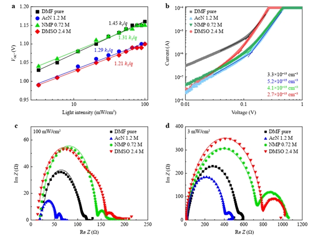 图2:基于四种钙钛矿层溶剂体系(纯 DMF、AcN 1.2 M、NMP 0.72 M、DMSO 2.4 M)的 Suns-VOC 、SCLC 曲线和不同光照下的阻抗谱曲线