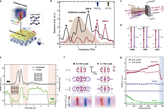 图:太赫兹脉冲激发下斯格明子的集体动力学模式与瞬态极性相。(a)通过太赫兹共振激发集体振荡模式诱导瞬态极性相示意图。(b)斯格明子集体振荡模式的动力学相场模拟结果。(c)测试装置示意图。(d)瞬态二次谐波响应的理论模型。(e)干涉式太赫兹场致二次谐波(iTFISH)测量结果。(f)集体振荡模式的空间运动模式模拟结果。(g)斯格明子太赫兹动力学的温度稳定性。