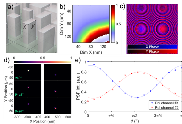 研究团队还引入偏振复用功能到晶体硅超表面光学元件中(如图2)。通过打破单个方形散射体的对称性,引入可变边长Y,实现了在绿色波长范围内对正交方向相位响应的独立调控。以编码两个具有焦点偏移的双曲金属透镜轮廓为例,展示了单个孔径超表面光学元件可实现偏振复用聚焦控制。这种功能极大地拓展了晶体硅超表面光学元件的应用范围,使其在偏振相关的成像和光场调控领域具有更高的实用价值。