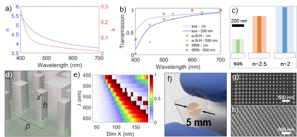 在材料选择与处理方面,研究人员选用商业可得的高质量蓝宝石衬底上的晶体硅(SOS)材料(如图1)。通过精确控制材料厚度为230nm,在保证可见光范围内提供足够相位覆盖的同时,最大程度降低了短波长处的损耗。并且,利用标准纳米制造工艺,实现了对结构完整性纳米级别的高度控制,确保了制造过程的高精度和稳定性,为大规模生产高质量晶体硅超表面光学元件提供了可行方案。
