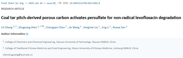 FCSE 前沿研究:煤焦油沥青基多孔碳活化过硫酸盐实现左氧氟沙星的非自由基降解。论文标题:Coal tar pitch-derived porous carbon activates persulfate for non-radical levofloxacin degradation