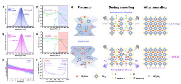 针对传统生长方法导致钙钛矿中氯元素分布不均的问题,团队提出了垂直方向均匀化氯元素分布的策略(HVCD):通过在钙钛矿薄膜生长中引入碱金属草酸盐,利用解离出的钾离子与氯离子之间的强结合作用,有效束缚氯元素的垂直无序迁移,使其在钙钛矿材料中均匀分布。基于这一方法,研究团队成功制备出载流子寿命高达20微秒,界面缺陷态密度低至1013每立方厘米的钙钛矿半导体薄膜,显著抑制了由卤素Cl元素上表面富集引起的载流子复合,并消除了界面电子势垒。