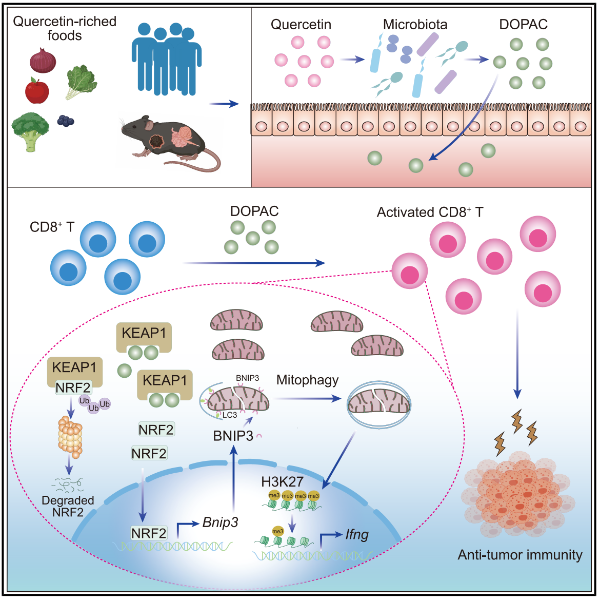 这项由山东大学齐鲁医院教授李石洋和山东大学基础医学院教授袁得天团队合作开展的研究首次证实,苹果皮、紫洋葱等常见食材中的槲皮素并不能直接抗癌,而是需经肠道菌群代谢转化为3,4-二羟基苯乙酸(英文简称为DOPAC)后,才能化身激活免疫细胞(主要是CD8?T 细胞)的“兴奋剂”。