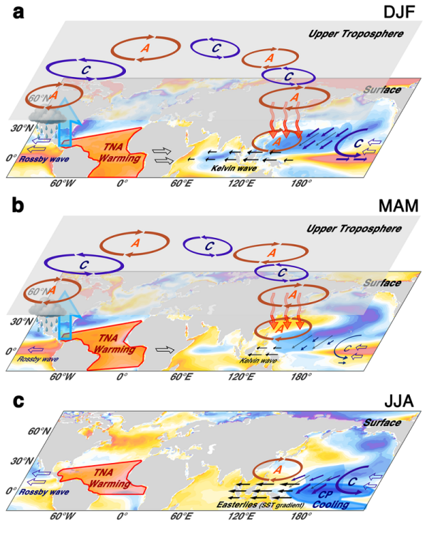 研究发现,在全球变暖背景下,WNPAC在冬、春、夏三季均显著增强,主要受大西洋和太平洋海温变化驱动。其中,大西洋通过增强赤道波响应和准定常罗斯贝波列,在冬季和春季发挥越来越重要的作用;夏季则以赤道罗斯贝波机制为主。太平洋在夏季的贡献最为显著,其机制在于印太暖池与中西太平洋之间的海温梯度增强,这一变化引发了异常的东风。相比之下,印度洋的影响在未来气候中相对较弱且较为稳定。