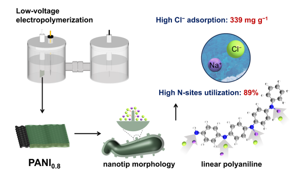 在卤水资源电化学提取过程中,需兼顾电中性原则,因此高效提取伴生阴离子同样重要。聚苯胺(PANI)凭借优异的导电性和可逆掺杂特性,广泛应用于能源存储、环境净化和离子分离等领域。然而,传统PANI因氮活性位点利用率低、微宏观构效关系不明确等问题,限制了其在高性能电化学脱盐中的应用。