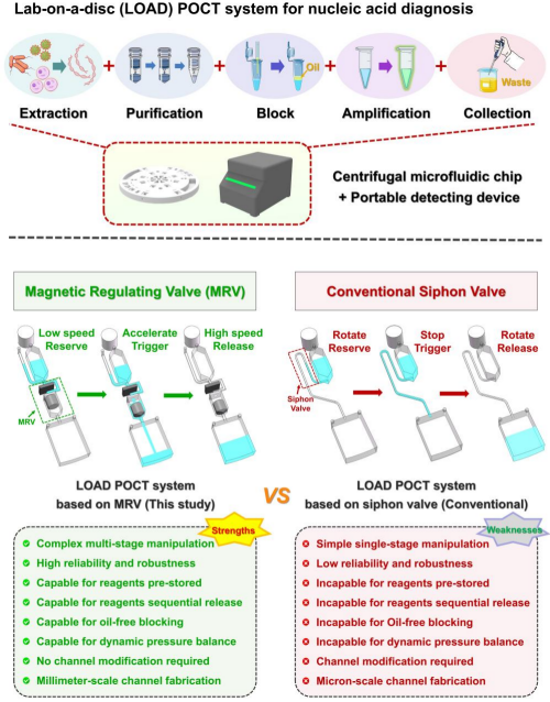 这一研究将磁控阀门技术与离心微流控POCT系统相结合,提升了检测的自动化和可靠性,为病原体现场快速诊断提供了高效工具。该策略有望进一步扩展至其他新兴检测方法,推动下一代POCT平台发展。