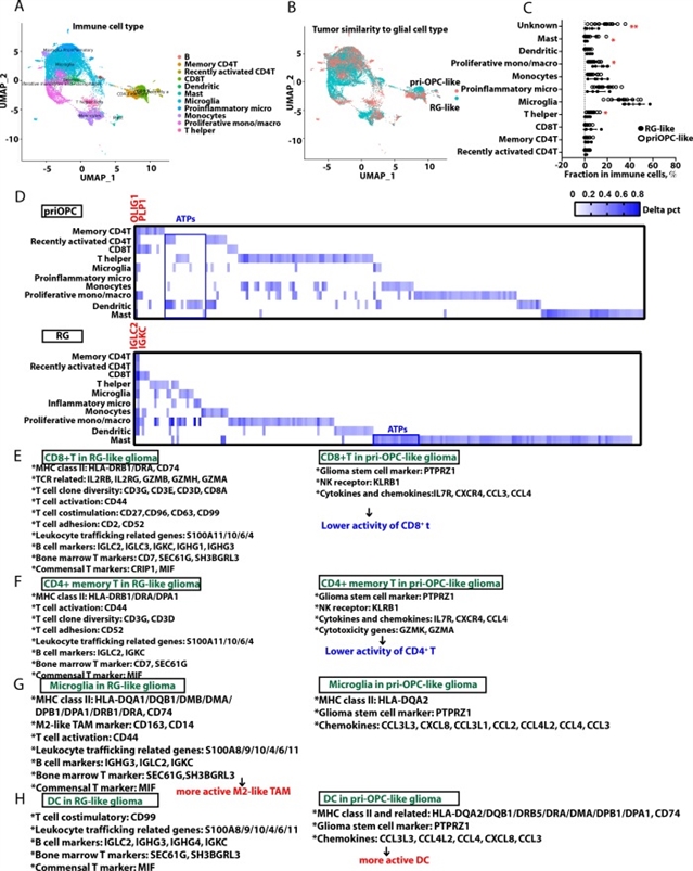 图5 RG样和pri-OPC样胶质瘤通过不同机制广泛重编程肿瘤浸润免疫细胞