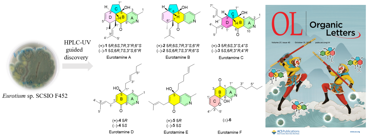 南海真菌新异喹啉生物碱对映体研究获进展。 在国家自然科学基金等项目资助下,中国工程院院士、中国科学院南海海洋研究所研究员张偲团队在南海沉积环境来源真菌中活性新骨架异喹啉型生物碱对映异构体的发现研究方面取得新进展。相关成果近日发表于《有机化学通讯》(Organic Letters),并入选补充封面(Supplementary Cover)。