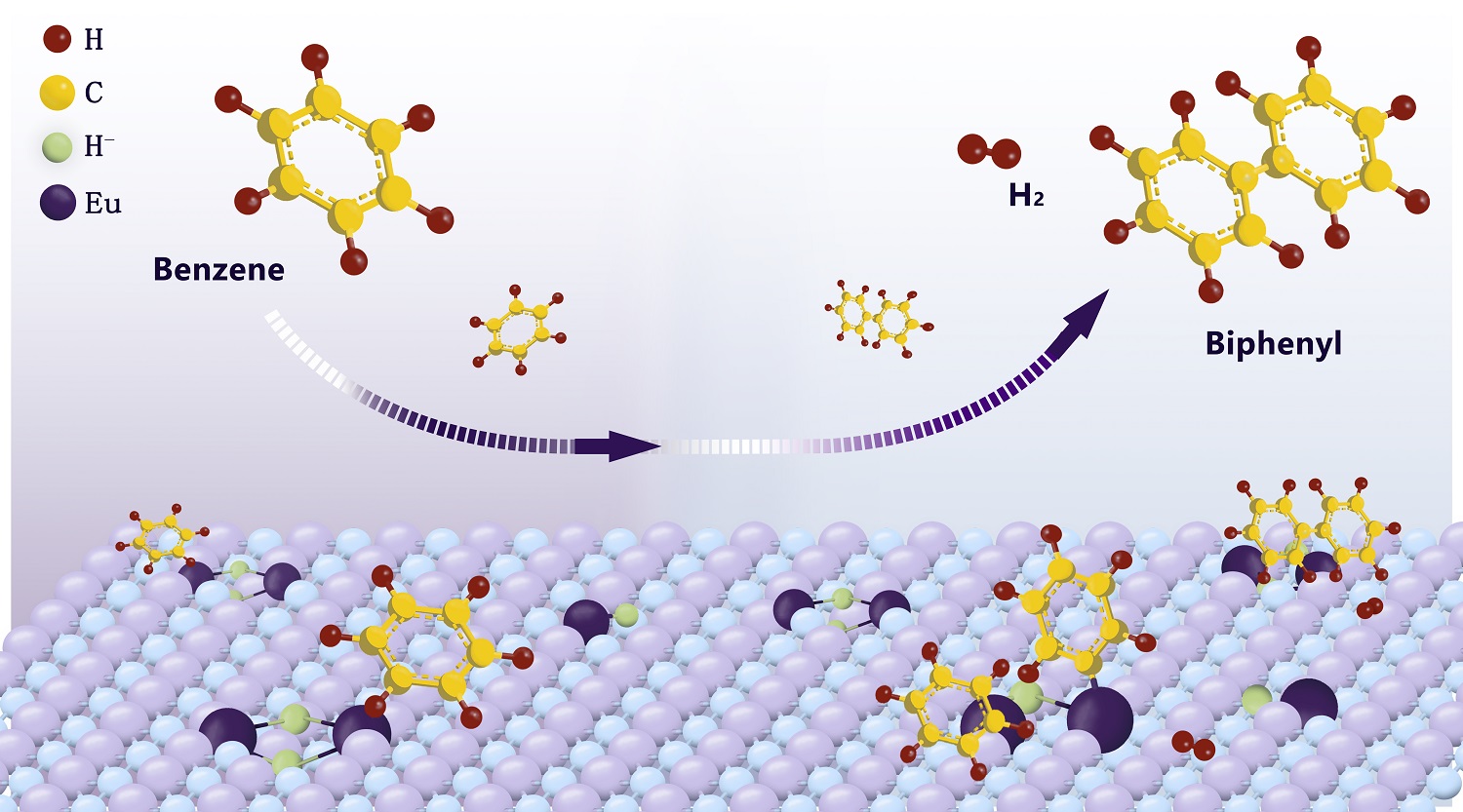 本工作中,团队采用液氨浸渍-加氢还原方法,制备出高分散的亚纳米结构氢化铕催化剂。该催化剂能够在无氧化剂、无需后处理的条件下,实现苯分子的直接脱氢偶联反应,生成联苯与氢气两种高价值产物。理论计算表明,催化剂表面Eu-H物种在C-H键活化及C-C键偶联过程中发挥关键作用:一方面促进苯环C-H键活化及脱质子化过程;另一方面通过调控苯与联苯在催化剂表面的吸附、脱附能垒,实现高效催化循环,展现了氢化物介导C-H活化的新模式。(来源:中国科学报 孙丹宁)