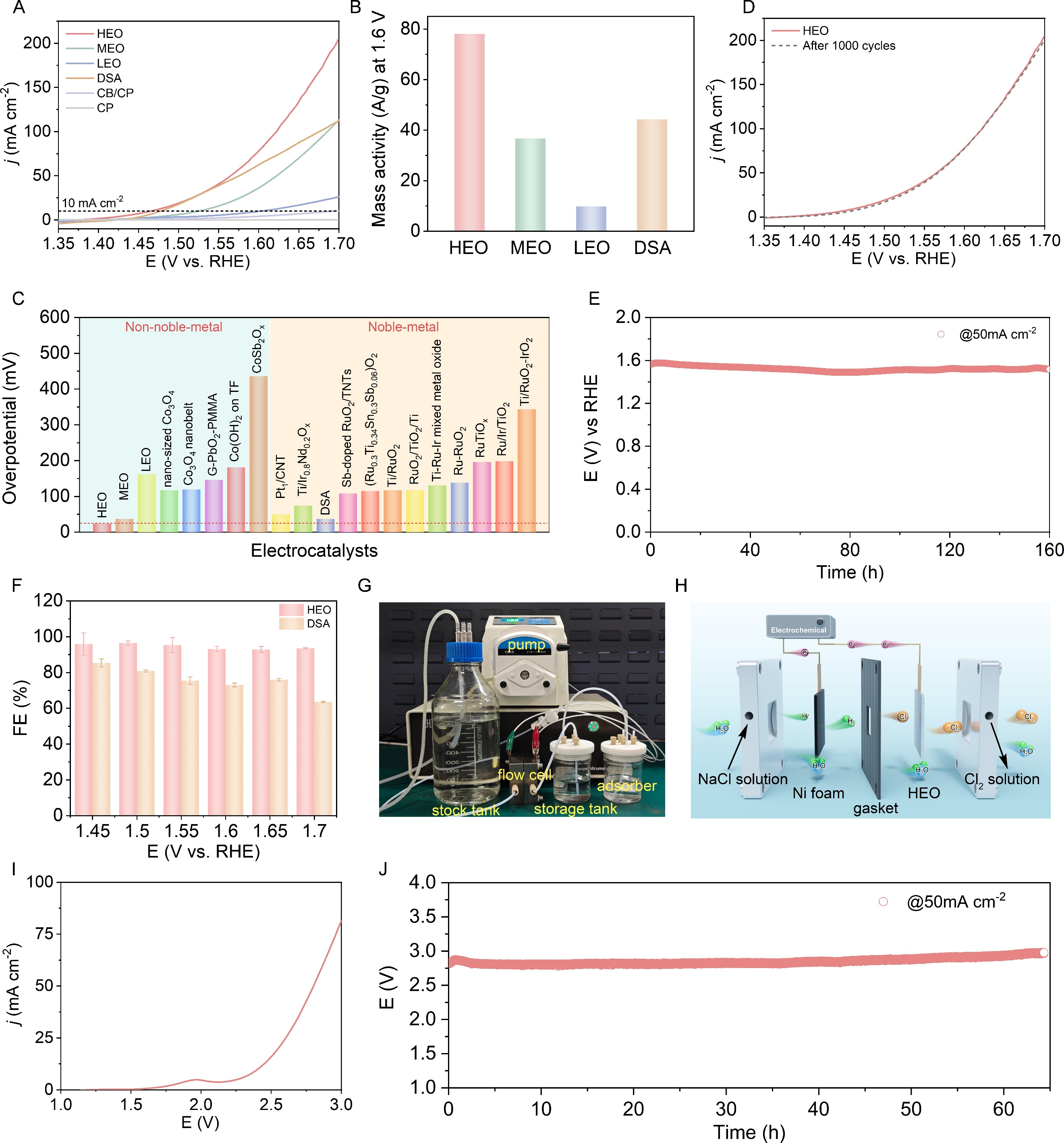 团队随后采用1173 K固相煅烧法成功合成出纯相十元MSb2O6高熵氧化物,并通过XRD、HAADF-STEM和ICP-OES确认其为均一分布的三金红石结构。应力分析进一步揭示该体系具有显著的晶格应变,从而弱化了金属-氧键、增强了电子迁移与中间体吸附能力,从而显著加快Cl-的电化学氧化动力学。