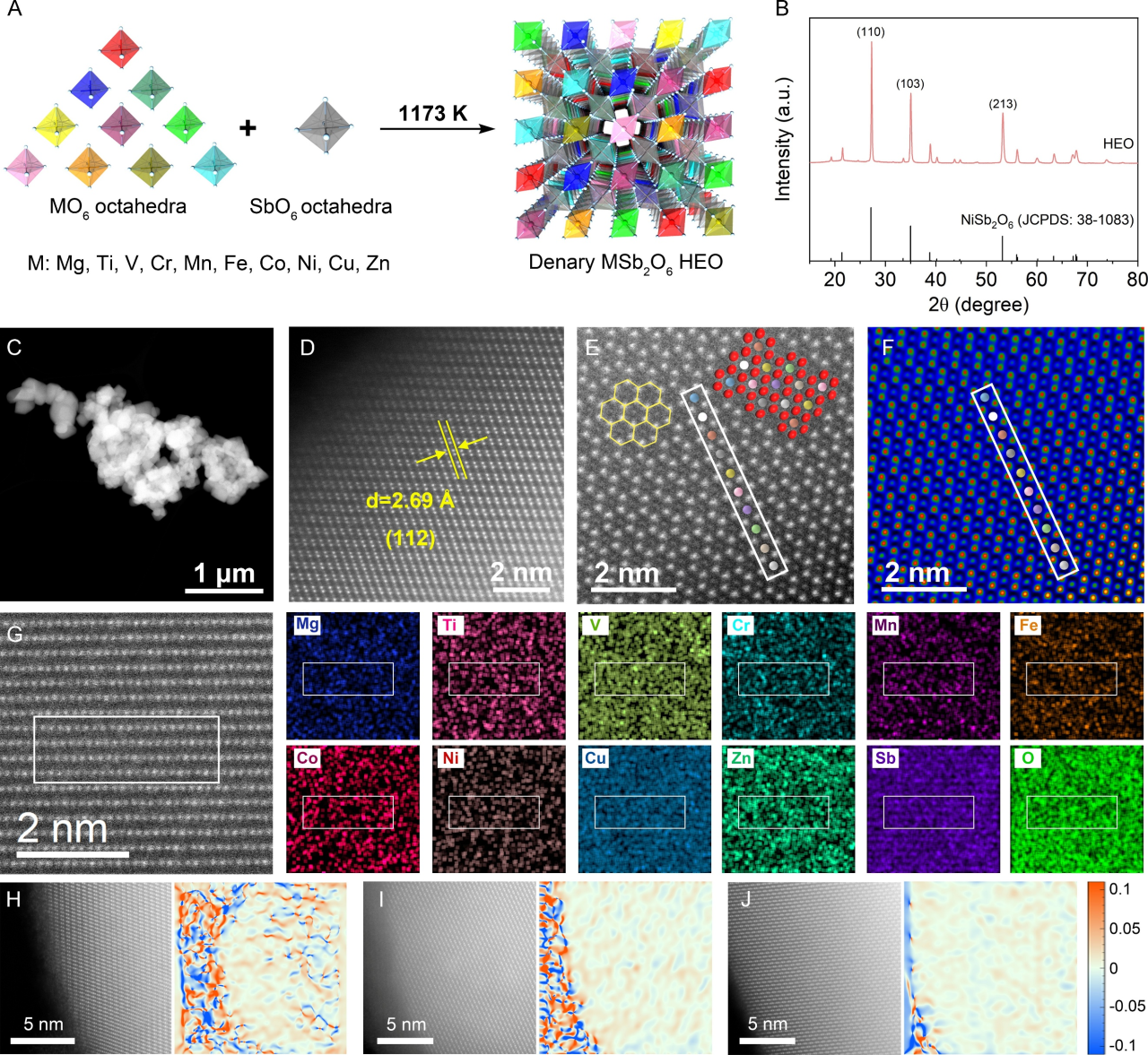 图2:十元高熵MSb2O6的结构表征与应力分析。