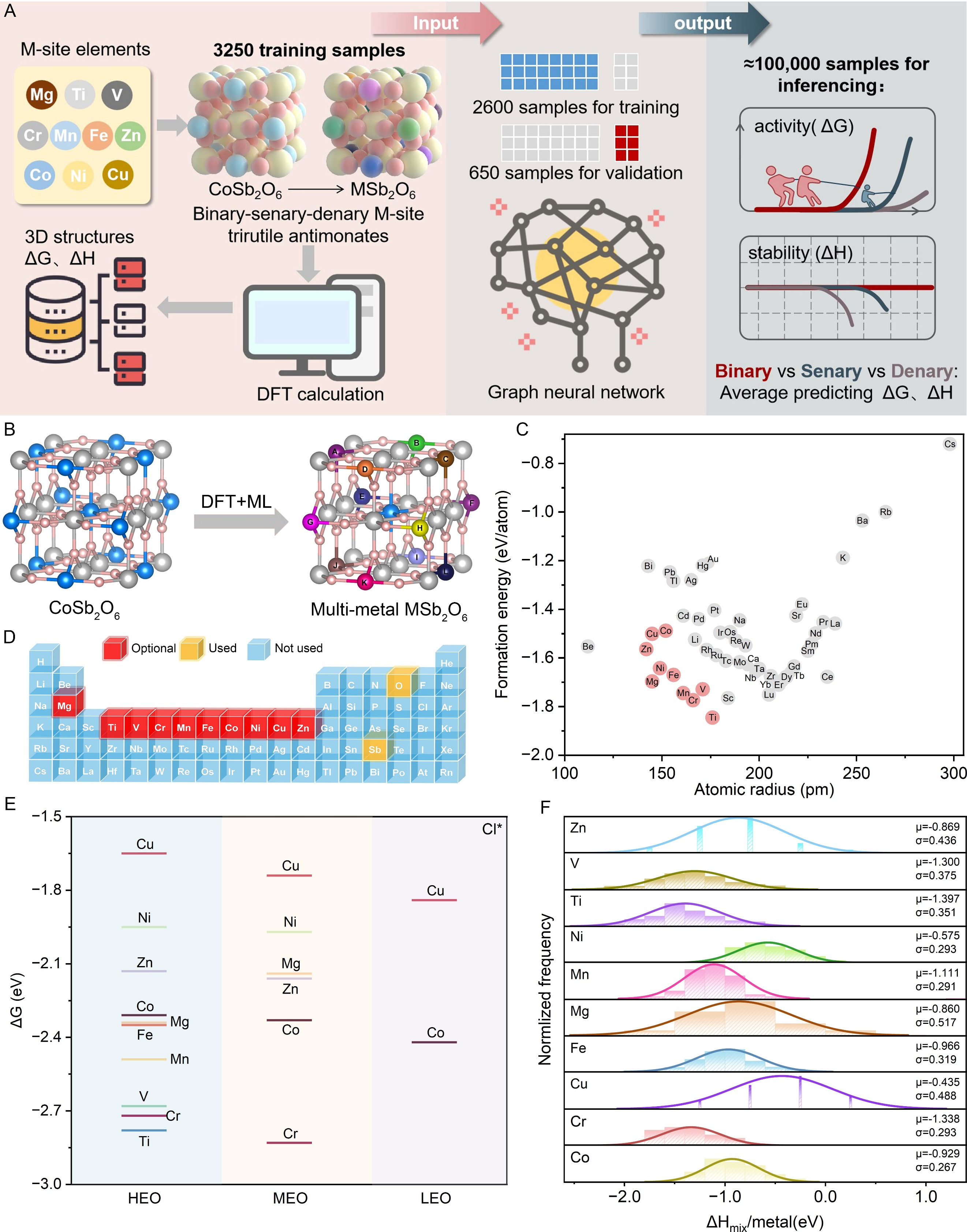 氯气是现代化工体系中最重要的基础原料之一,全球每年产量超过7,000万吨,主要通过盐水电解制得。然而,氯气电解制备的核心阳极长期依赖含贵金属的尺寸稳定阳极(DSA),如RuO2与IrO2,尽管性能优异,但高成本与资源稀缺成为制约氯碱工业绿色转型的关键瓶颈。面对能源转型与双碳目标,开发兼具高活性与高稳定性的非贵金属析氯电极已成为行业和学术界的共同目标。针对这一挑战,研究团队提出了原子级熵引导(entropy-guided)材料发现策略,从单一的CoSb2O6结构出发,通过DFT系统计算不同金属取代后形成能与晶格兼容性,从元素周期表中筛选出10种金属构建可稳定共存的高熵体系(MSb2O6,M = Mg, Ti, V, Cr, Mn, Fe, Co, Ni, Cu, Zn)。进一步结合图神经网络(GNN)与蒙特卡洛采样,在105个可能构型中预测出最具热力学与电催化优势的组合,揭示高熵材料的多组元无序结构可降低体系自由能(ΔG = ΔH − TΔS)并优化活性位的电子分布。理论计算表明,随着金属组元由2、6到10种逐步增加,反应能垒不断降低,Cu位点成为最优活性中心。
