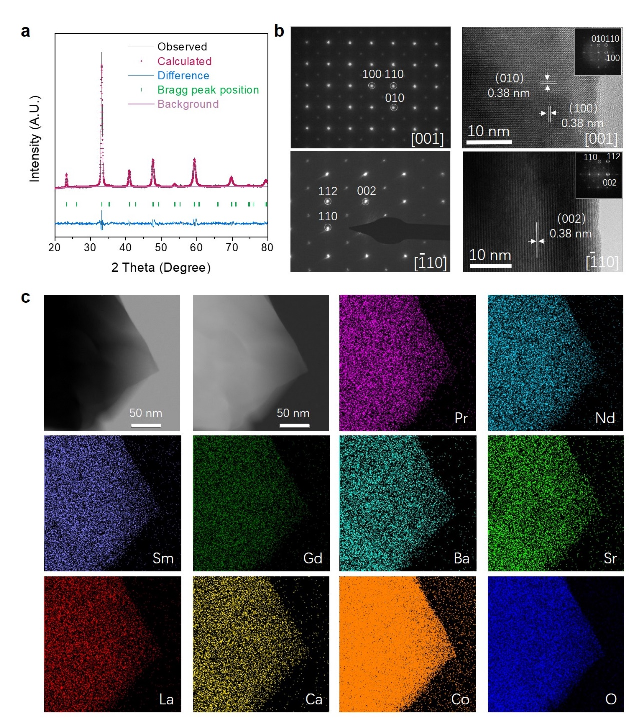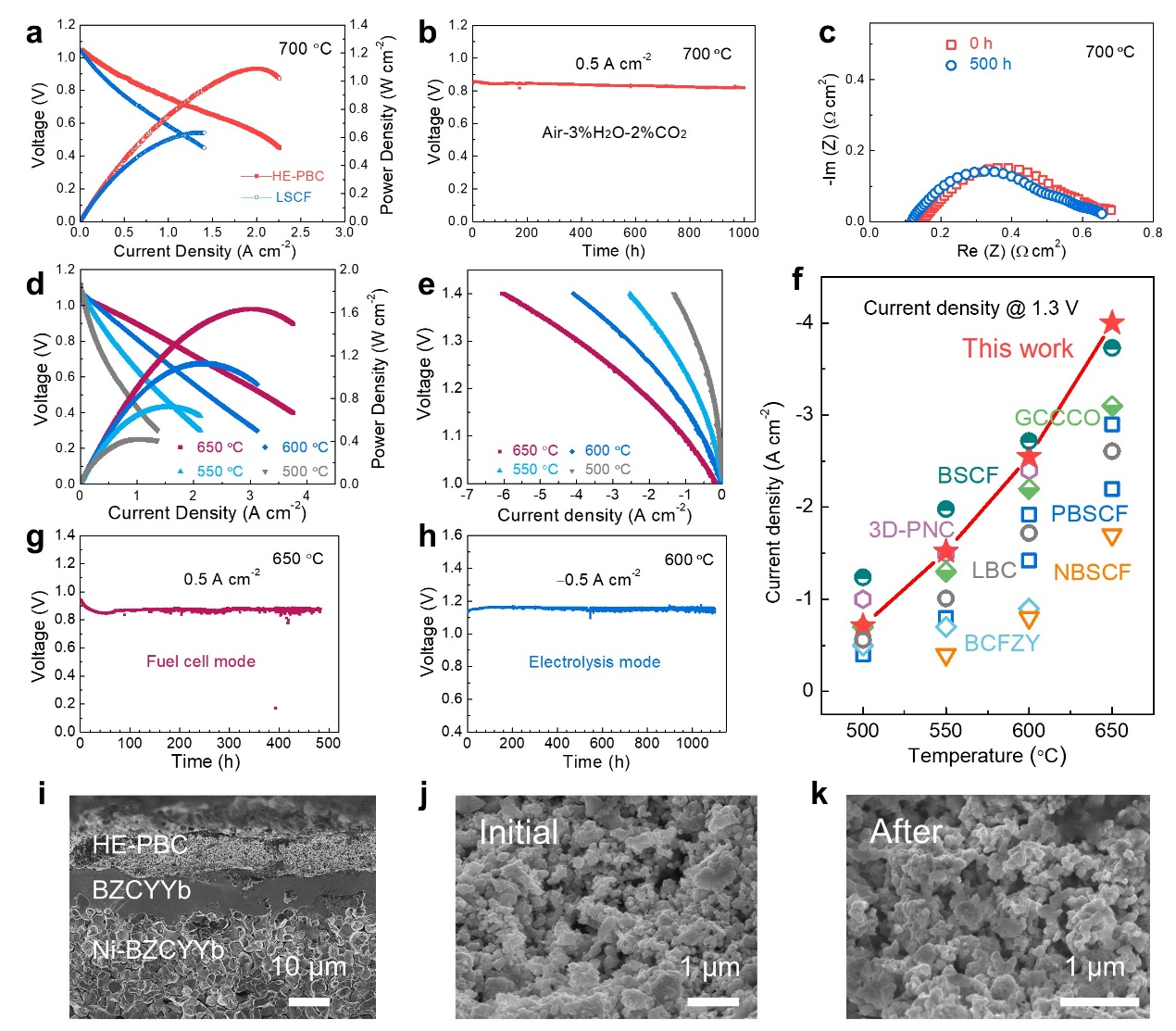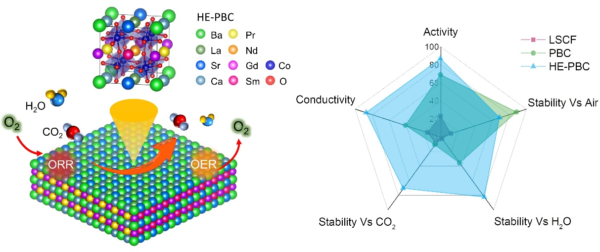 该成果报道了一种兼顾高活性和高耐久性的钙钛矿氧电极材料:Pr0.25Nd0.25Gd0.25Sm0.25Ba0.25La0.25Sr0.25Ca0.25Co2O5+δ (HE-PBC),实现了可逆固体氧化物电池(Reversible solid oxide cells, RSOCs)的高性能和高稳定性。