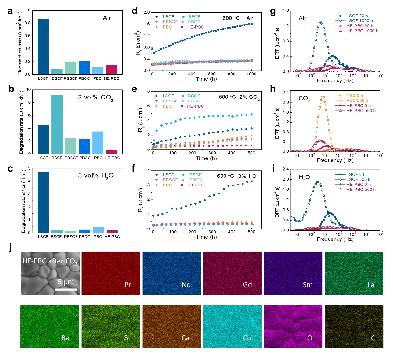 图4:LSCF, BSCF, PBSCF, PBCC, PBC和HE-PBC氧电极材料的耐久性。
